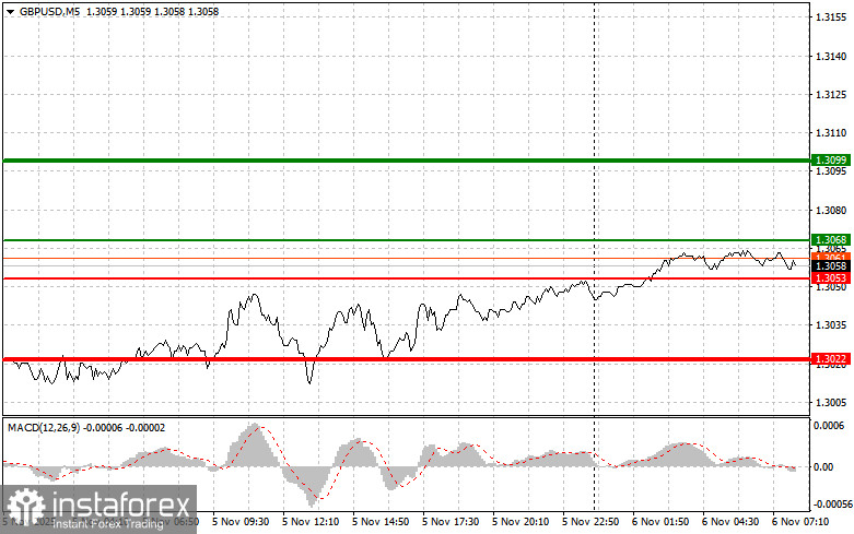 Scénario #2 : Je prévois également d'acheter des livres sterling aujourd'hui dans le cas de deux tests consécutifs du prix 1.3053 lorsque l'indicateur MACD est en zone de survente. Cela limitera le potentiel de baisse de la paire et mènera à un retournement haussier du marché. Une augmentation peut être attendue vers les niveaux opposés de 1.3068 et 1.3099.