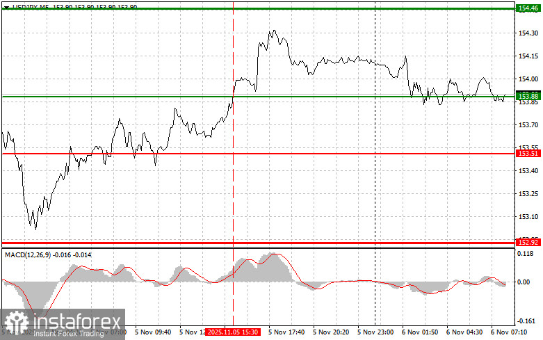 La paire de devises USD/JPY a eu du mal à maintenir sa position mercredi. Le test du niveau de prix à 153.88 a coïncidé avec l'indicateur MACD qui commençait juste à se déplacer vers le bas à partir de la marque zéro, ce qui a limité le potentiel de hausse de la paire. Pour cette raison, je n'ai pas acheté de dollars et j'ai manqué un léger mouvement à la hausse.