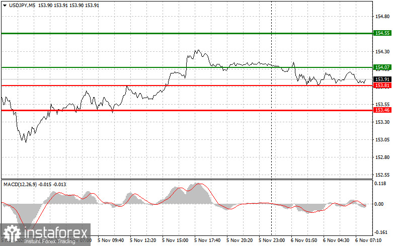 Scénario #2 : Je prévois également d'acheter USD/JPY aujourd'hui si le prix teste deux fois 153.81 alors que l'indicateur MACD est en zone de survente. Cela limitera le potentiel de baisse de la paire et entraînera une inversion haussière du marché. On peut s'attendre à une augmentation vers les niveaux opposés de 154.07 et 154.55.