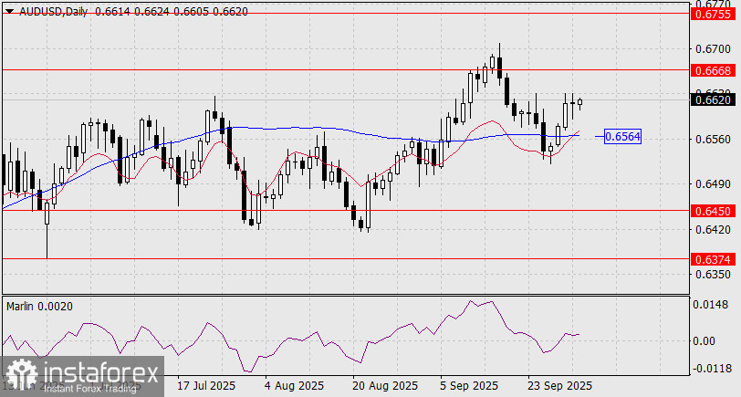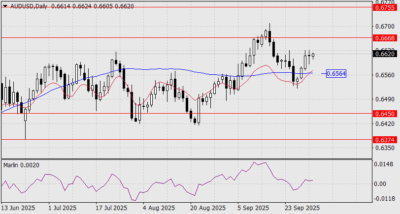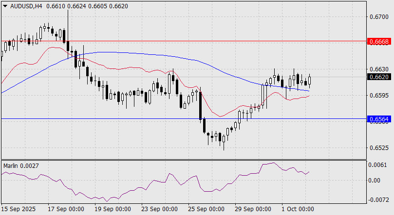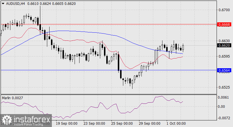 На четырёхчасовом масштабе цена консолидируется над линией Крузенштерна. Осциллятор Марлин сбросил напряжение, готов к новой волне роста. Краткосрочная тенденция восходящая, цель 0.6668 открыта.