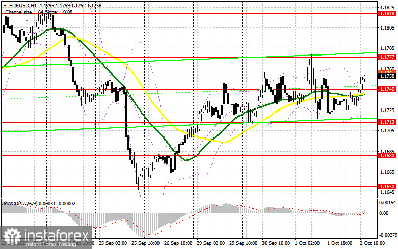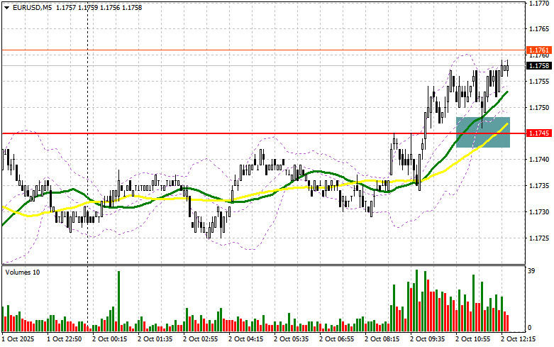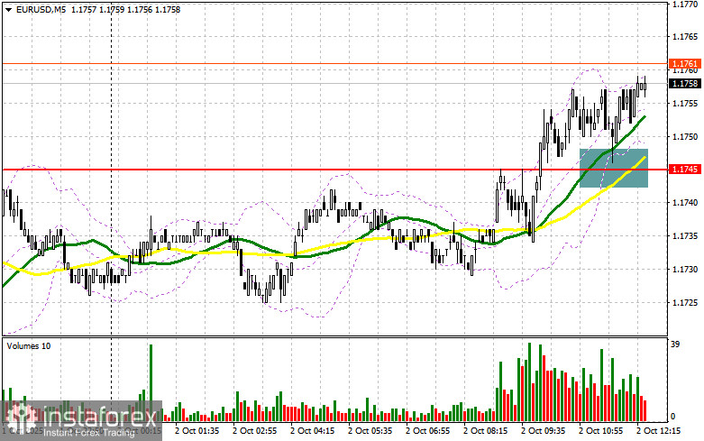 В своем утреннем прогнозе я обращал внимание на уровень 1.1745 и планировал от него принимать решения по входу в рынок. Давайте посмотрим на 5-минутный график и разберемся с тем, что там произошло. Прорыв и обратный тест 1.1745 привели к точке входа на покупку евро, что вылилось лишь в рост на 15 пунктов. На вторую половину дня техническая картина не пересматривалась.