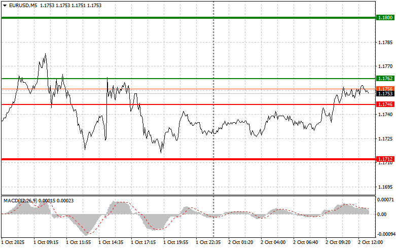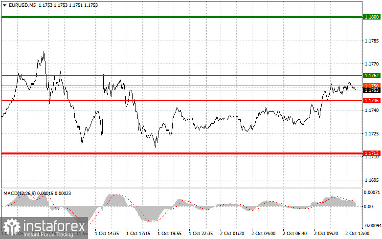 Сценарий №2: покупать евро сегодня также собираюсь в случае двух подряд тестов цены 1.1746 в момент, когда индикатор MACD будет находиться в области перепроданности. Это ограничит нисходящий потенциал пары и приведет к обратному развороту рынка вверх. Можно ожидать рост к противоположным уровням 1.1762 и 1.1800.