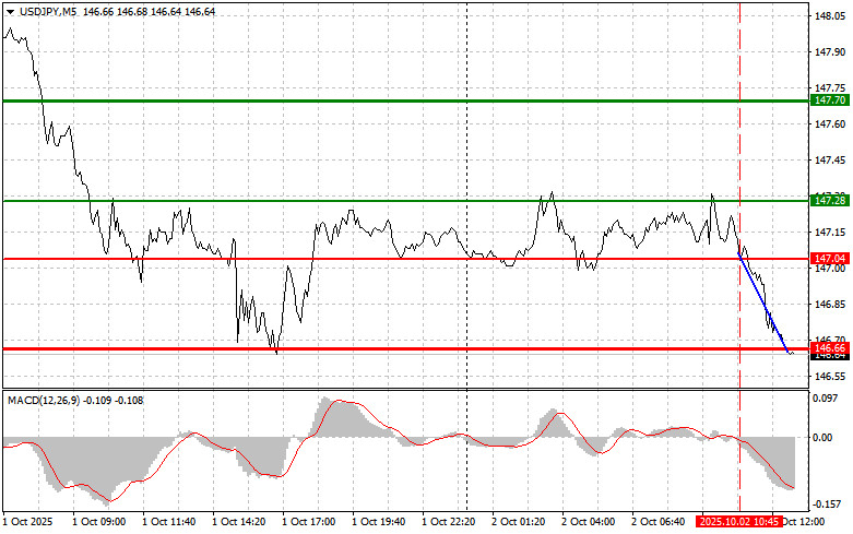 Сценарий №2: покупать USD/JPY сегодня также планирую в случае двух подряд тестов цены 146.51 в момент, когда индикатор MACD будет находиться в области перепроданности. Это ограничит нисходящий потенциал пары и приведет к обратному развороту рынка вверх. Можно ожидать рост к противоположным уровням 146.82 и 147.22.