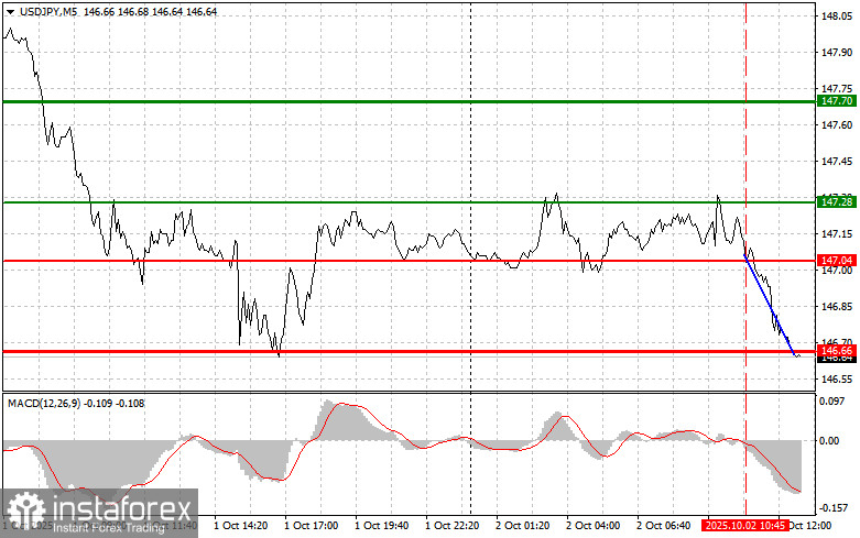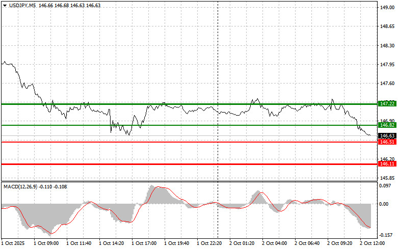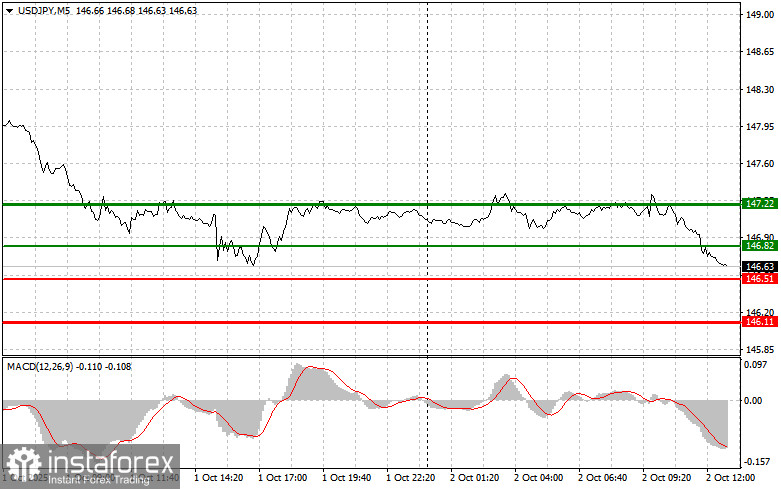 Сценарий №2: продавать USD/JPY сегодня также планирую в случае двух подряд тестов цены 146.82 в момент, когда индикатор MACD будет находиться в области перекупленности. Это ограничит восходящий потенциал пары и приведет к обратному развороту рынка вниз. Можно ожидать снижения к противоположному уровню 146.51 и 146.11.