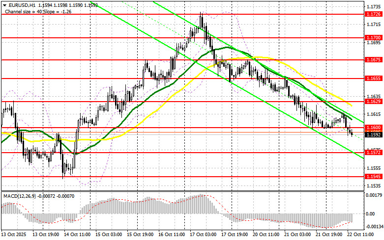 Евро продолжает терять в паре с американским долларом, и на фоне отсутствия статистики по еврозоне в этом нет ничего удивительного. Во второй половине дня выступает лишь член FOMC Майкл С. Барр. Учитывая полное игнорирование долларом голубиной повестки представителей ФРС, на сильный рост евро вряд ли получится рассчитывать. В случае дальнейшего движения пары вниз лишь формирование ложного пробоя в районе 1.1572 будет поводом для открытия новых длинных позиций в расчете на возврат к сопротивлению 1.1600, еще утром выступавшему в роли поддержки. Прорыв и обратный тест этого диапазона станут подтверждением правильной точки входа с выходом к области 1.1629. Самой дальней целью будет уровень 1.1655, где буду фиксировать прибыль. При варианте снижения EUR/USD и отсутствия активности в районе 1.1572 давление на евро только возрастет. Медведи в таком случае сумеют дотянуться до 1.1545. Лишь после формирования там ложного пробоя собираюсь действовать на покупку евро. Открывать длинные позиции сразу на отскок планирую от 1.1520 с целью восходящей коррекции в 30-35 пунктов внутри дня.