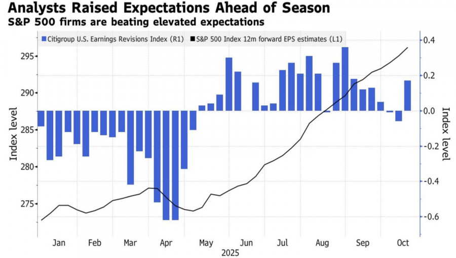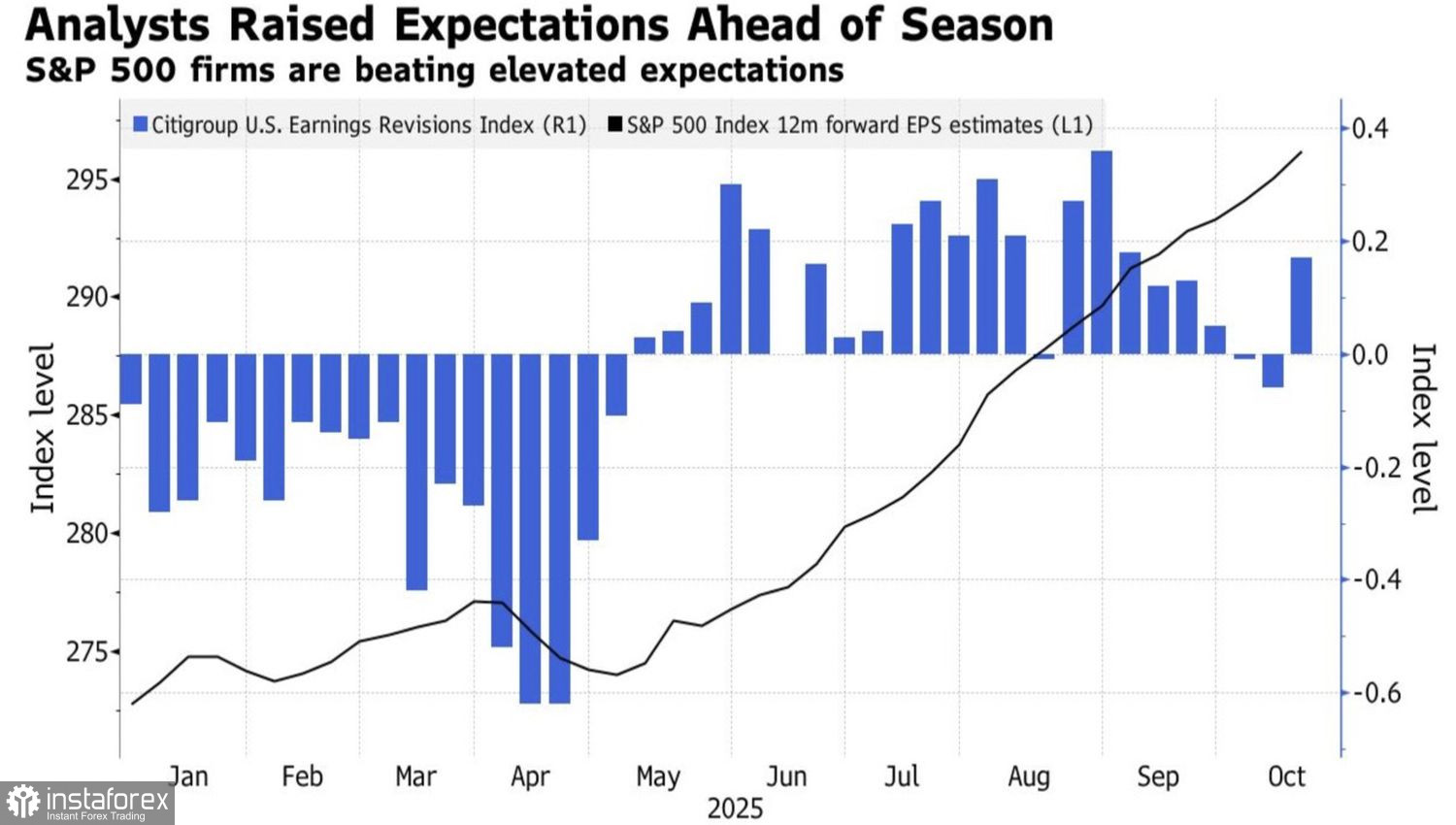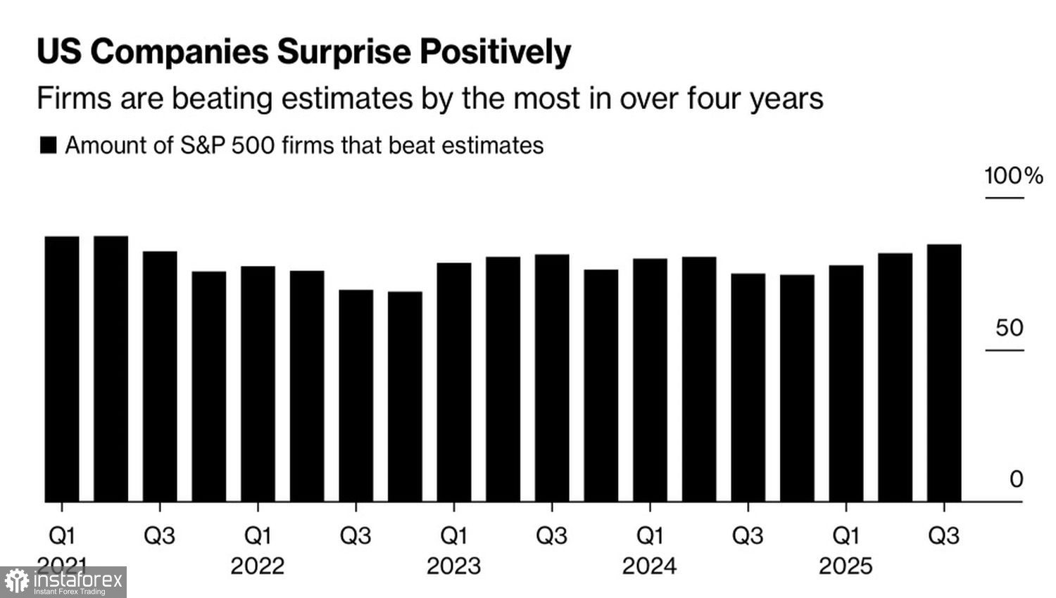 Корпоративные результаты вселяют осторожный оптимизм. Около 85% компаний из индекса S&P 500, уже опубликовавших отчёты за третий квартал, превзошли прогнозы аналитиков — это лучший показатель с 2021 года. Хотя пока отчиталась лишь пятая часть компаний, тенденция указывает на устойчивость корпоративной прибыли, несмотря на тарифное давление и экономическую неопределённость.