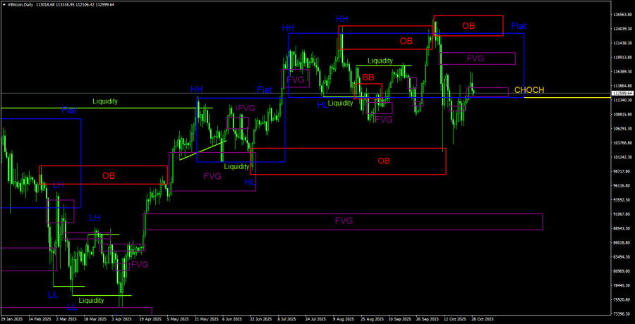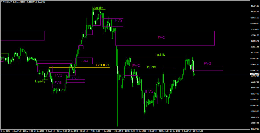 На 4-часовом таймфрейме техническая картина очень плохая. Биткоин опять растет, но в данное время невозможно выделить ни восходящую структуру, ни нисходящую. Было сформировано два снятия ликвидности на продажу, а также «медвежий» FVG. Таким образом, в краткосрочной перспективе следует ожидать падения. Но на дневном ТФ техническая картина полностью противоположная, а вечером – заседание ФРС, которое может спровоцировать абсолютно любую реакцию рынка.