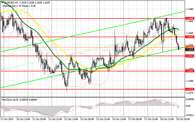 Продавцы проявили себя в ходе азиатских торгов, так как разногласия в рядах ФРС, о которых поползли слухи, продолжают сказываться на рыночных настроениях. Основной задачей медведей на первую половину дня будет защита ближайшего сопротивления 1.1645. Лишь после формирования там ложного пробоя может думать о движении евро вниз к поддержке 1.1621. Прорыв и закрепление ниже этого диапазона, а также обратный тест снизу вверх, станут еще одним подходящим вариантом на открытие коротких позиций с движением в район 1.1602. Самой дальней целью выступит область 1.1675, где буду фиксировать прибыль. В случае движения вверх EUR/USD, а также отсутствия активных действий медведей в районе 1.1645, где проходят средние скользящие, играющие на стороне продавцов, короткие позиции лучше всего отложить до более крупного уровня 1.1668. Продавать там будут только после неудачного закрепления. Открывать короткие позиции сразу на отскок я планирую от 1.1696 с целью нисходящей коррекции в 30-35 пунктов.