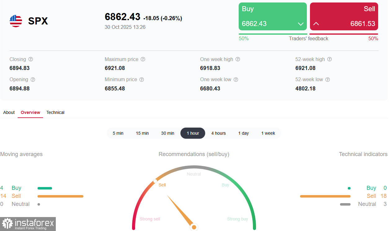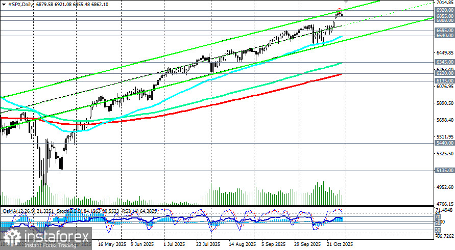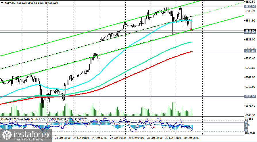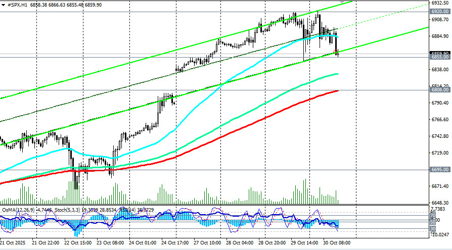 Так, индекс широкого рынка США S&P500 сегодня торгуется (во фьючерсах SPX в торговом терминале) со снижением почти на 1,00% от достигнутого сегодня утром рекордного максимума вблизи 6920.00, снижаясь в сторону ближайших поддержек 6855.00, 6830.00, 6808.00 (200-периодная скользящая средняя на 1-часовом графике) и «круглой» отметки 6800.00.