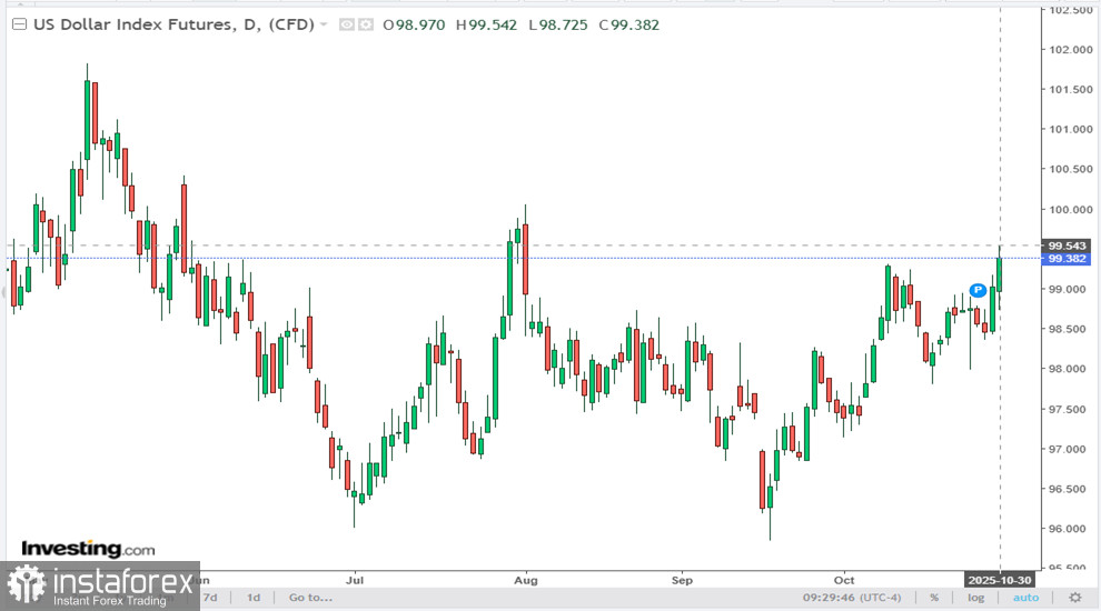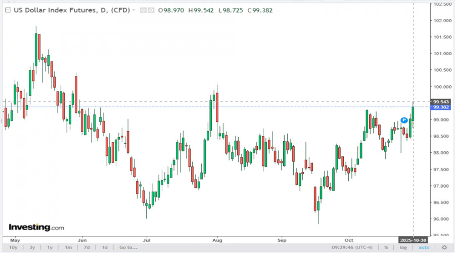 Несмотря на это, Председатель ФРС Джером Пауэлл подчеркнул неопределенность относительно следующего шага, поставив под сомнение необходимость снижения ставки в декабре. Такое заявление привело к росту индекса доллара USDX, который поднялся выше уровня 99.38 (на текущий момент), демонстрируя усиление американской валюты против основных конкурентов.