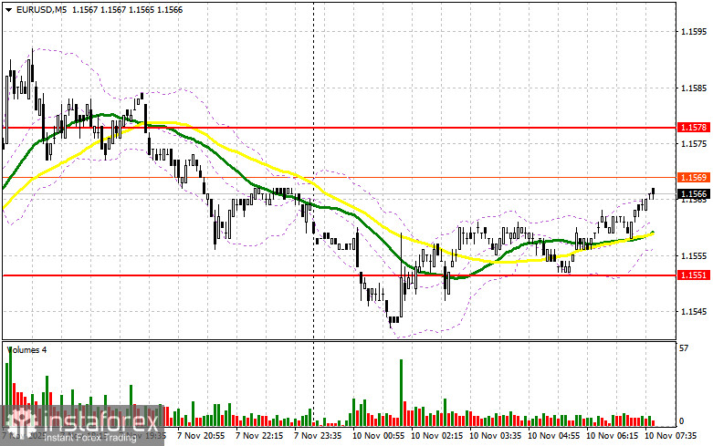 В прошлую пятницу я так и не дождался подходящих точек входа в рынок. Давайте посмотрим на 5-минутный график и разберемся с тем, что там произошло. В своем утреннем прогнозе я обращал внимание на уровень 1.1551 и планировал от него принимать решения по входу в рынок. Рост в район 1.1551 произошел, но теста этого уровня так и не состоялось, так что я остался без сделок. Во второй половине дня нормальных точек входа от уровня 1.1578 я также не получил.