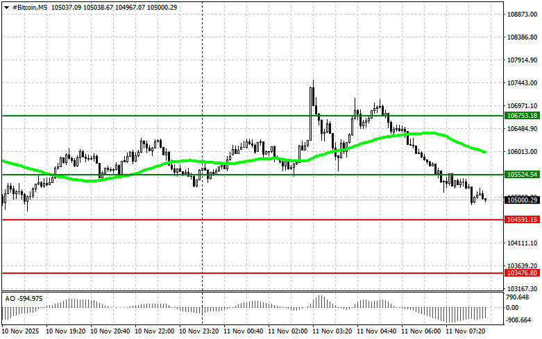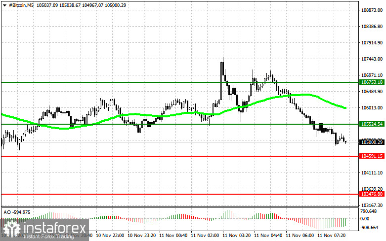 Сценарий №2: покупать биткоин можно от нижней границы $104 600 при отсутствии рыночной реакции на ее пробой в обратную сторону к уровням $105 500 и $106 700.