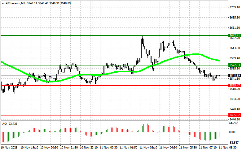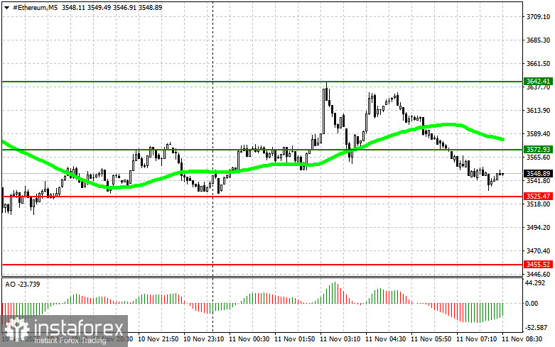 Сценарий №2: покупать эфир можно от нижней границы $3525 при отсутствии рыночной реакции на ее пробой в обратную сторону к уровням $3572 и $3642.