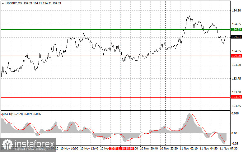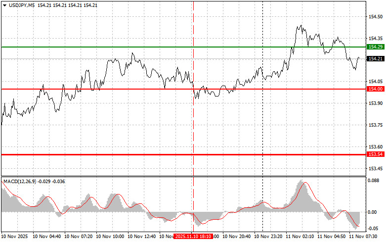 Сценарий №2: продавать USD/JPY сегодня также планирую в случае двух подряд тестов цены 154.39 в момент, когда индикатор MACD будет находиться в области перекупленности. Это ограничит восходящий потенциал пары и приведет к обратному развороту рынка вниз. Можно ожидать снижения к противоположному уровню 154.06 и 153.54.