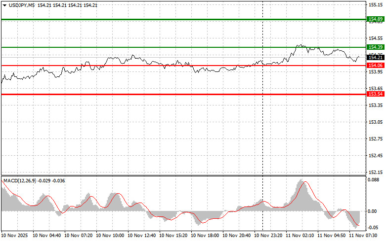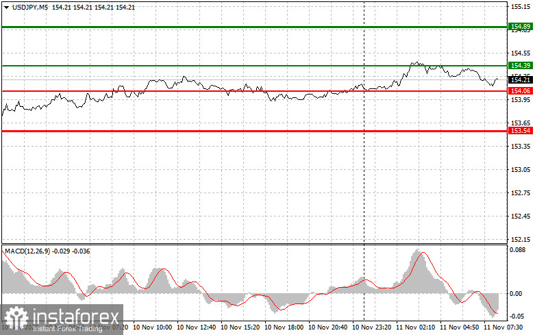 Сценарий №2: покупать USD/JPY сегодня также планирую в случае двух подряд тестов цены 154.06 в момент, когда индикатор MACD будет находиться в области перепроданности. Это ограничит нисходящий потенциал пары и приведет к обратному развороту рынка вверх. Можно ожидать рост к противоположным уровням 154.39 и 154.89.