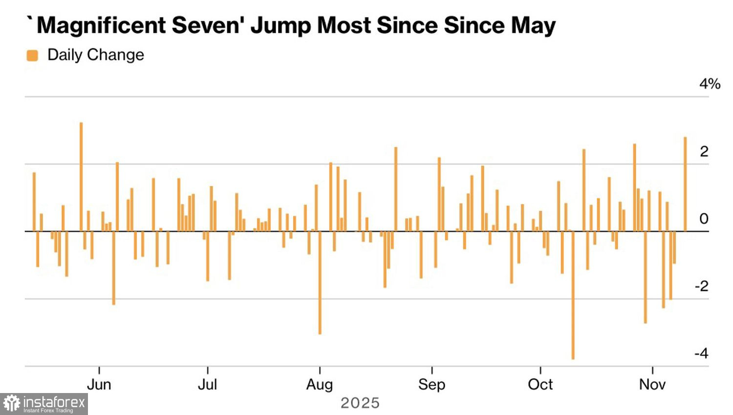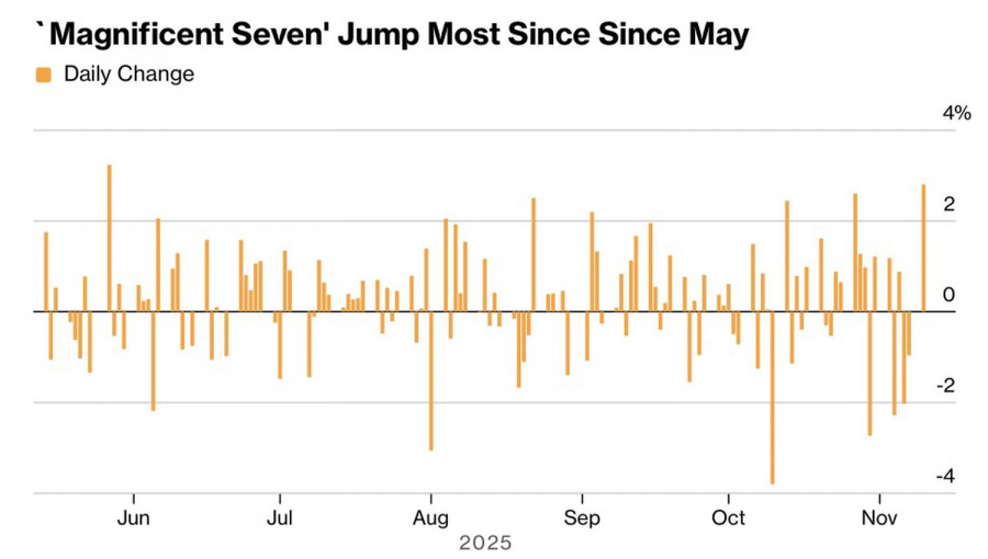 И последние станут первыми. Признаки ухудшения состояния экономики США и неопределенность из-за шатдауна заставляли инвесторов диверсифицировать портфели. В начале ноября они сокращали долю технологических компаний. Слухи о скором возобновлении работы правительства вернули все на круги своя. Бумаги Великолепной семерки отметились лучшей динамикой с мая. В результате S&P 500 восстал из пепла.