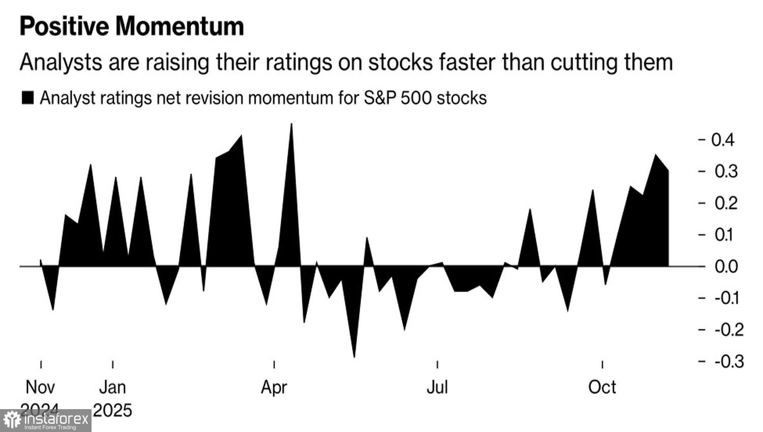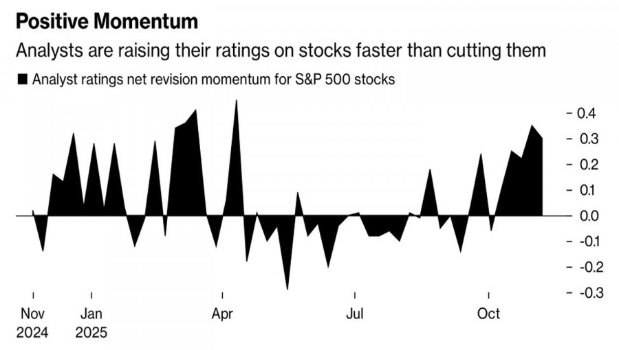 Действительно, в третьем квартале прибыль эмитентов S&P 500 выросла на 14,6%, вдвое превзойдя оценки. Morgan Stanley в качестве «бычьего» фактора указывает и постоянный пересмотр прогнозов экспертов Уолл-стрит в сторону повышения. Разница между оптимистами и пессимистами достигла максимальной отметки с апреля.