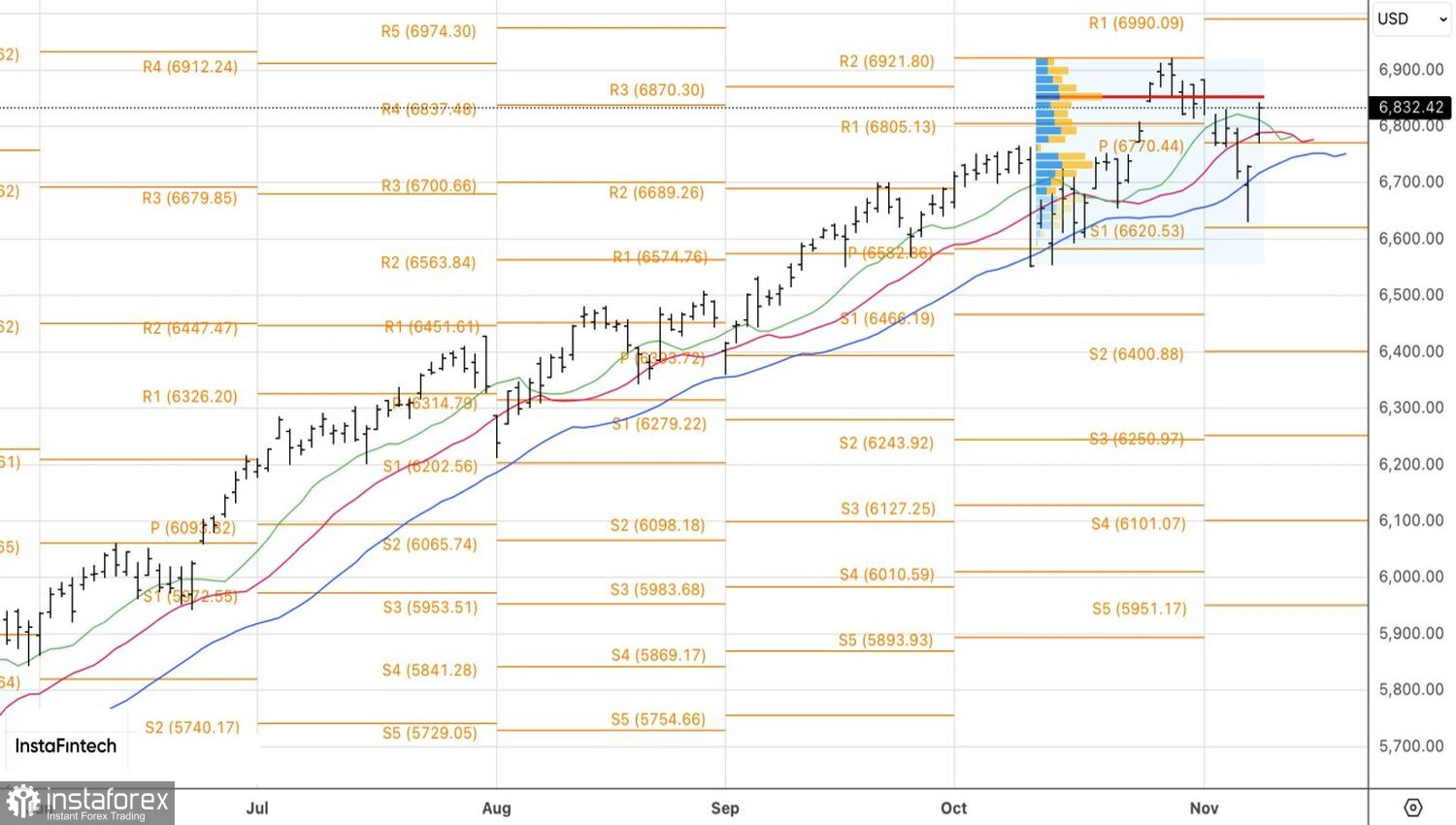 Технически на дневном графике S&P 500 покупатели легко отыграли пин-бар и открыли торги гэпом вверх. Все скользящие средние остались позади, что говорит о серьезности намерений «быков». Сформированные от 6731 лонги следует удерживать и наращивать. В качестве таргетов выступают отметки 7000 и 7140.