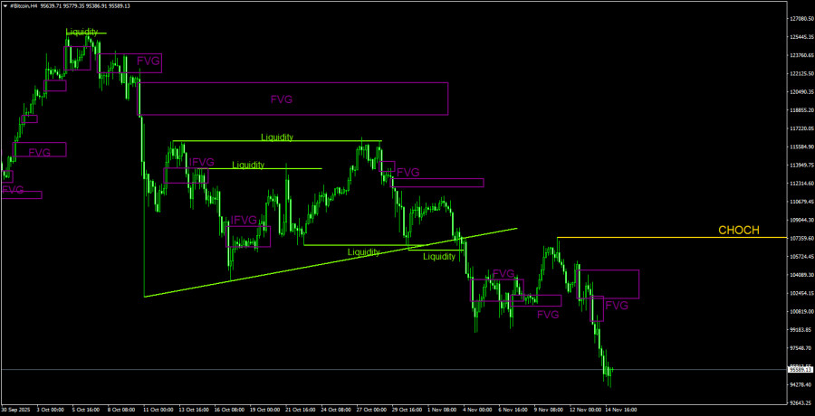 На 4-часовом таймфрейме техническая картина указывает на нисходящий тренд. Линия CHOCH(слом тренда) проходит на уровне 107 400$, и только выше этого уровня можно будет считать, что локальная тенденция сломлена. При чем цена должна не просто пробить его(что будет считаться снятием ликвидности с очевидного экстремума), а закрепиться выше него. До этого нисходящий настрой рынка сохраняется даже в краткосрочной перспективе. На 4-часовом ТФ последние два «медвежьих» FVG были отработаны, цена получила реакцию и продолжила падение. Новых паттернов или снятий ликвидности нет.