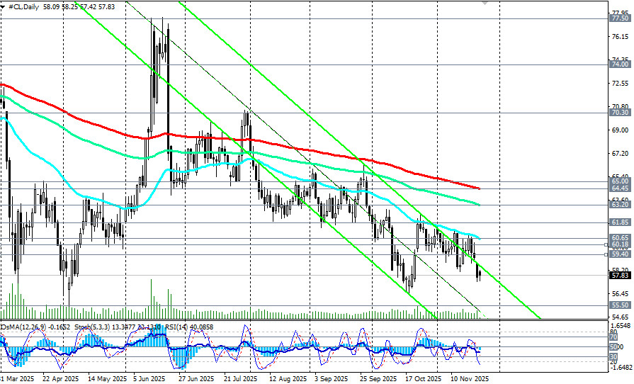 Лишь рост в зону краткосрочного бычьего рынка и выше уровней сопротивления 59.40 (ЕМА200 на 1-часовом графике), 60.00, 60.18 (ЕМА200 на 4-часовом графике), а затем пробой уровня сопротивления 60.65 (50-периодная скользящая средняя на дневном графике) может сигнализировать о начале возрождения восходящей динамики цены (подробнее см. в WTI (CL): сценарии динамики на 24.11.2025).