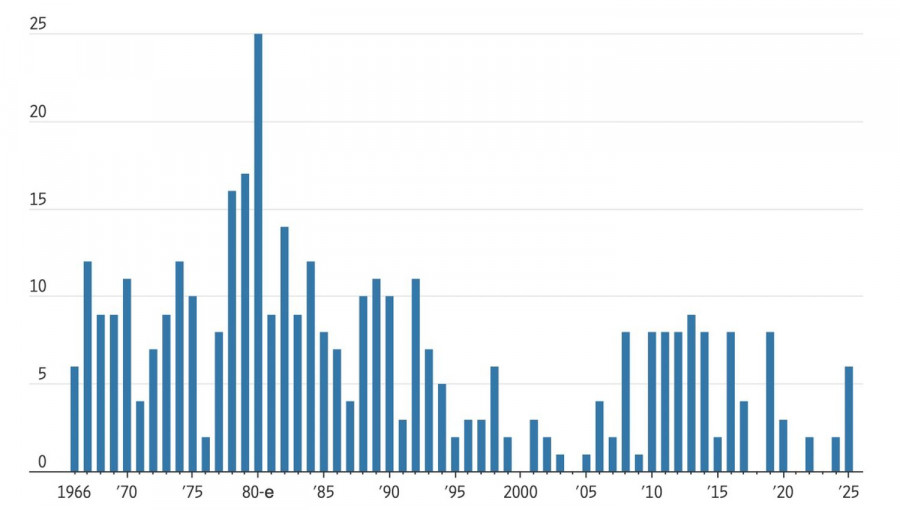 Динамика числа несогласных с вердиктами ФРС по ставке