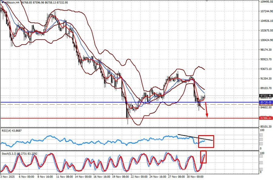 Токен торгуется к доллару чуть выше уровня поддержки 85730.00 в ожидании публикации на этой неделе отчета по количеству новых рабочих мест от ADP и отчета инфляционного показателя PCE, которые выйдут на этой неделе. Уровнем для продажи криптовалютной пары может служить отметка 85260.00.