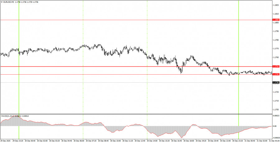 На 5-минутном ТФ во вторник не было сформировано ни одного торгового сигнала, макроэкономический и фундаментальный фон отсутствовал, а общая волатильность дня составила 36 пунктов. Сегодня ночью был сформирован сигнал на продажу, так как цена закрепилась ниже области 1,1745-1,1754. Таким образом, начинающие трейдеры могут открывать короткие позиции в расчете на прибыль в размере 20-30 пунктов, если у них есть желание торговать 31 декабря.