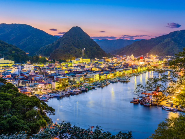 Симода, расположенный на южной оконечности полуострова Идзу, омывается водами Тихого океана. Город известен уютными белоснежными пляжами и зелеными холмами, спускающимися к заливу. В Симоде сохранились здания эпохи Эдо и исторический порт, где в XIX веке был подписан первый японо-американский договор. Среди ключевых достопримечательностей – храм Рюсен-дзи, улицы с традиционными домами, а также каналы с арочными мостами.