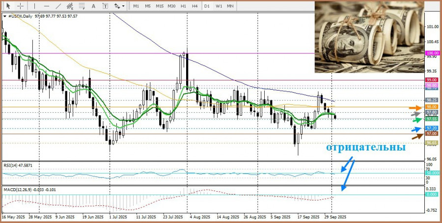 Ближайшее сопротивление у индекса 97,80, на пути к круглому уровню 98,00. Но пока осцилляторы на дневном графике отрицательны, путь наименьшего сопротивления нисходящий.