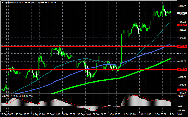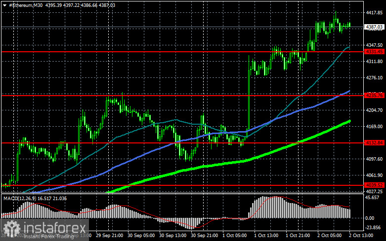 Сценарий №2: покупать эфир можно от нижней границы $4366 при отсутствии рыночной реакции на ее пробой в обратную сторону к уровням $4414 и $4484.