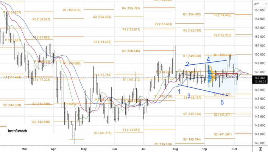 Технически на дневном графике USD/JPY имеет место тест сопротивлений на 147,80-147,85. Здесь находится справедливая стоимость и важный пивот-уровень. Повторный штурм в случае успеха станет основанием для формирования лонгов. Неудача, напротив, позволит продавать пару.