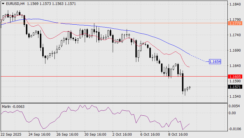 На графике четырёхчасового масштаба тенденция ярко выраженная понижающаяся. В этом есть некоторый признак замедления тенденции. Также осциллятор Марлин бурно реагирует на всякое повышение цены. Ждём отработку ближайшей цели 1.1495 в понедельник.