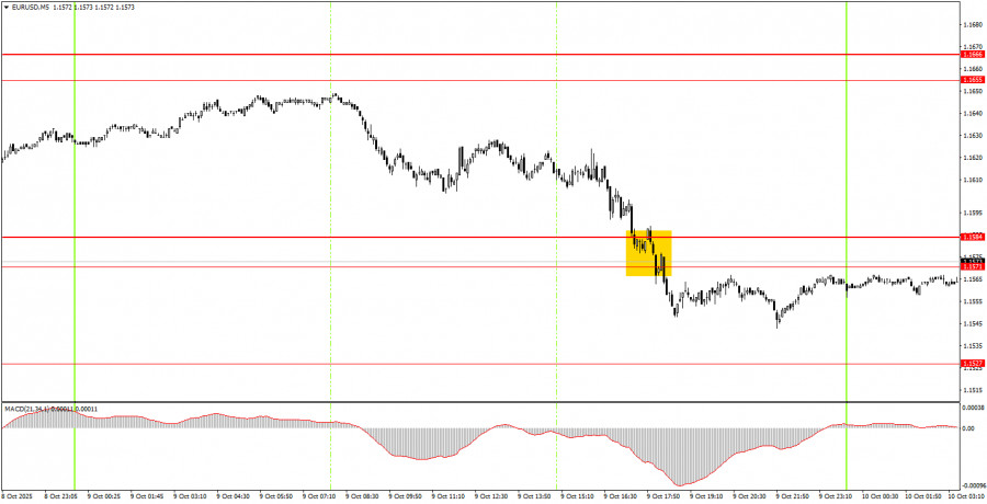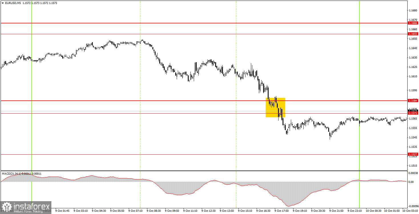 На 5-минутном ТФ единственный торговый сигнал был сформирован на американской торговой сессии. Цена преодолела область 1,1571-1,1584, но после формирования этого сигнала падение, по сути, завершилось. Отработать сигнал можно было, но прибыль он принес минимальную.