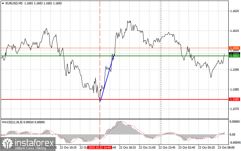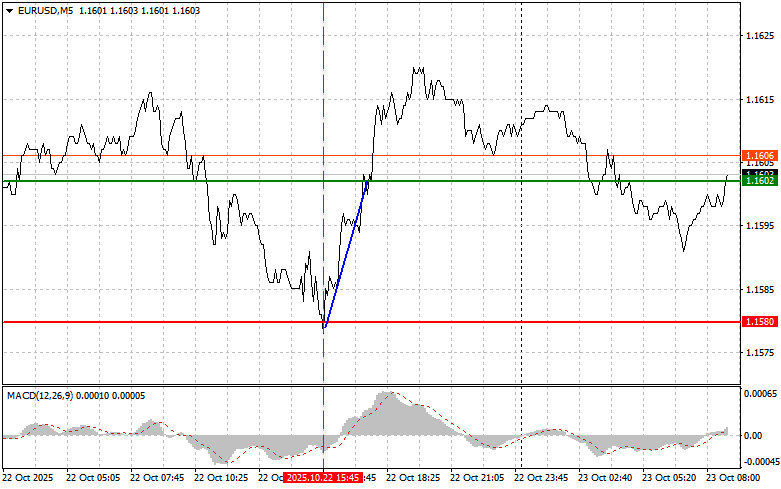 Тест цены 1.1580 пришелся на момент, когда индикатор MACD много прошел вниз от нулевой отметки и довольно давно находился в области перепроданности, что позволило реализоваться сценарию №2 на покупку евро. В результате пара выросла более чем на 25 пунктов.