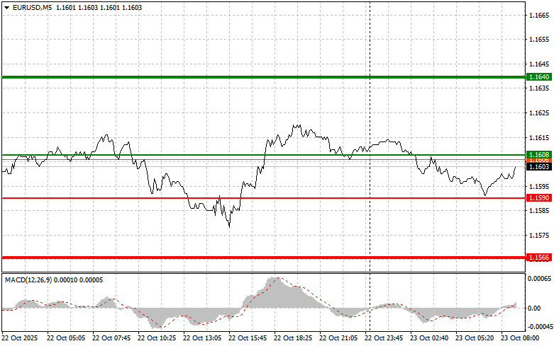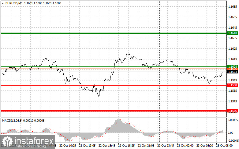 Сценарий №1: сегодня покупать евро можно при достижении цены в районе 1.1608 (зеленая линия на графике) с целью роста к уровню 1.1640. В точке 1.1640 планирую выходить из рынка, а также продавать евро в обратную сторону в расчете на движение в 30-35 пунктов от точки входа. Рассчитывать на рост евро можно только в рамках коррекции, опираясь на вчерашнюю слабость доллара. Важно! Перед покупкой убедитесь в том, что индикатор MACD находится выше нулевой отметки и только начинает свой рост от нее.