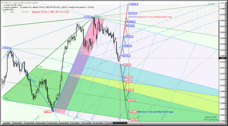 В случае пробоя ISL38.2 Minute-h4 - уровень поддержки 12290.0 - развитие движения Swiss Market Index продолжится в зонах равновесия вил операционных масштабов - младшего-Minuette-h1 (12290.0 - 12175.0 - 12060.0) и старшего-Minute-h4 (12135.0 - 11965.0 - 11790.0) с учетом отработки mininum 11861.0 от 26 сентября 2025 года.
