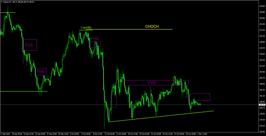На 4-часовом ТФ техническая картина ничем не лучше. С одной стороны, хорошо виден боковой уклон движения. С другой стороны, четких границ флэта выделить не удается. Если в данное время формируется флэт, то все его внутренние паттерны не имеют значения. Торговать можно только от границ бокового канала. Но четких границ нет. Отметить можно лишь восходящую линию тренда, которая является ничем иным, как пулом ликвидности. Проще говоря, ниже этой линии трейдеры располагают свои Stop Loss, а маркет-мейкеры наверняка захотят «съесть» эти ордера в будущем, так как для них это ликвидность. Таким образом, как и в случае с биткоином и эфиром, мы считаем, что солана опустится еще ниже. Теоретически для открытия коротких позиций можно использовать последний FVG, но уже сейчас видно, что цена отреагировала на него очень слабо. Напомним, что реакция на любой паттерн может быть абсолютно любой по силе.