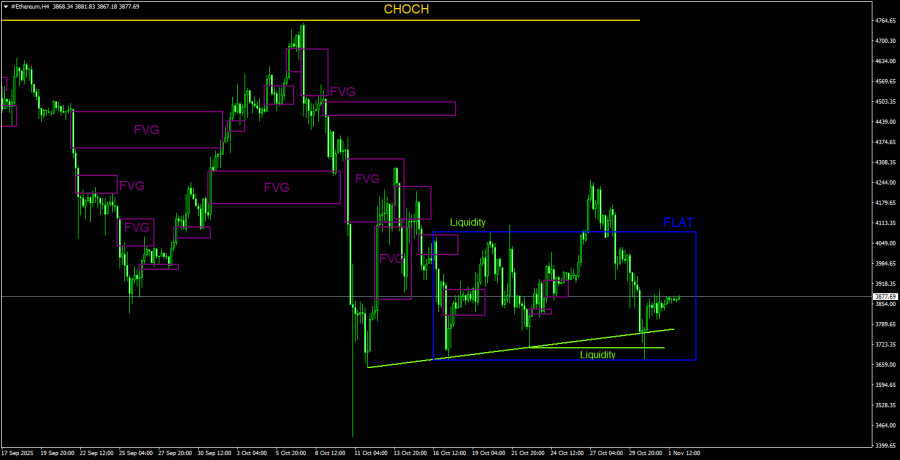 На 4-часовом таймфрейме сохраняется нисходящая тенденция. Однако из-за слишком сильного падения две недели назад техническая картина «сломалась». Можно выделить боковой канал между уровнями 3 671$ и 4 085$. Если этот флэт все еще сохраняется(а причин думать иначе сейчас нет), то его внутренние паттерны не имеют практически никакого значения. Сигналы следует искать около границ флэта – девиации и снятия ликвидности на продажу или на покупку. Четкой девиации верхней границы канала не произошло – цена ушла слишком высоко. Зато около нижней линии канала было сформировано снятие ликвидности на покупку с линии тренда и произошла отработка самой линии. Таким образом, сегодня-завтра эфир может показать некоторый рост.
