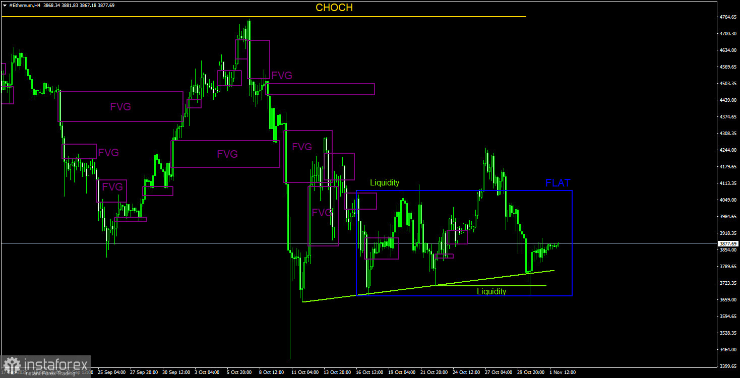 На дневном и 4-часовом ТФ восходящая тенденция отменена, падение может быть длительным и сильным. Ключевым паттерном на продажу выступал и выступает «медвежий» Order-block на недельном ТФ. Движение, спровоцированное этим сигналом, должно быть сильным и длительным. Ближайшими целями падения мы считаем области 3 550$ – 3 715$ и 3 085$ – 3 300$, которые представляют собой два «бычьих» FVG. Первая из них уже была отработана. На дневном ТФ в данное время имеется только один актуальный паттерн на продажу – IFVG. У биткоина имеется аналогичный паттерн, что очень хорошо, так как их отработка может совпасть.