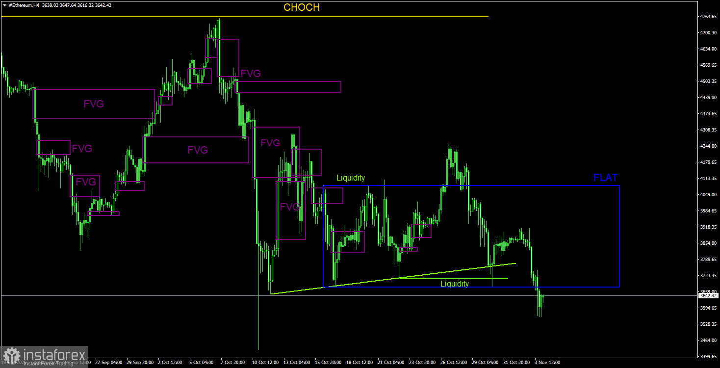 На дневном и 4-часовом ТФ восходящая тенденция отменена, падение может быть длительным и сильным. Ключевым паттерном на продажу выступал и выступает «медвежий» Order-block на недельном ТФ. Движение, спровоцированное этим сигналом, должно быть сильным и длительным. Ближайшими целями падения мы считаем области 3 550$ – 3 715$ и 3 085$ – 3 300$, которые представляют собой два «бычьих» FVG. Первая из них уже была отработана. На дневном ТФ в данное время имеется только один актуальный паттерн на продажу – IFVG. У биткоина имеется аналогичный паттерн, что очень хорошо, так как их отработка может совпасть. Также напомним, что около нижней границы флэта можно рассматривать краткосрочные покупки на основании девиации.