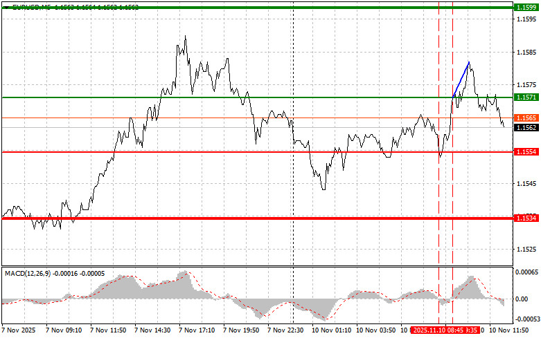 Разбор сделок и советы по торговле европейской валютойТест цены 1.1554 пришелся на момент, когда индикатор MACD только начинал движение вниз от нулевой отметки, что стало подтверждением правильной точки входа на продажу евро. Однако по сделке были зафиксированы убытки. Затем состоялся рост пары. В момент теста цены 1.1571 индикатор MACD только начинал движение вверх от нулевой отметки, что позволило купить евро. Однако рост составил лишь порядка 10 пунктов, после чего покупки ушли с рынка.Снижение уровня доверия инвесторов к экономике еврозоны стало