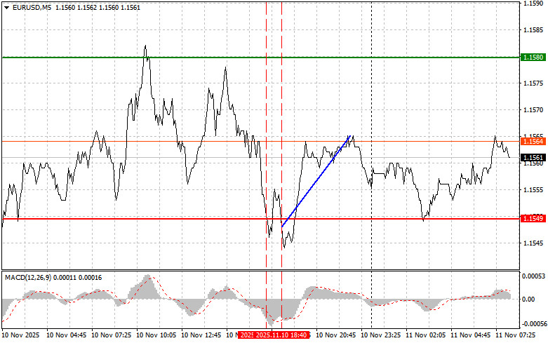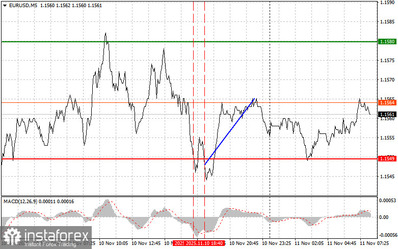 Тест цены 1.1549 пришелся на момент, когда индикатор MACD много прошел вниз от нулевой отметки, что ограничивало нисходящий потенциал пары. По этой причине я не продавал евро. Второй тест 1.1549 спустя короткий промежуток времени совпал с моментом нахождения MACD в области перепроданности, что привело к реализации сценария №2 на покупку. В результате пара выросла на 15 пунктов.