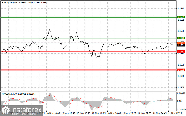 Сценарий №2: покупать евро сегодня также собираюсь в случае двух подряд тестов цены 1.1552 в момент, когда индикатор MACD будет находиться в области перепроданности. Это ограничит нисходящий потенциал пары и приведет к обратному развороту рынка вверх. Можно ожидать рост к противоположным уровням 1.1570 и 1.1599.