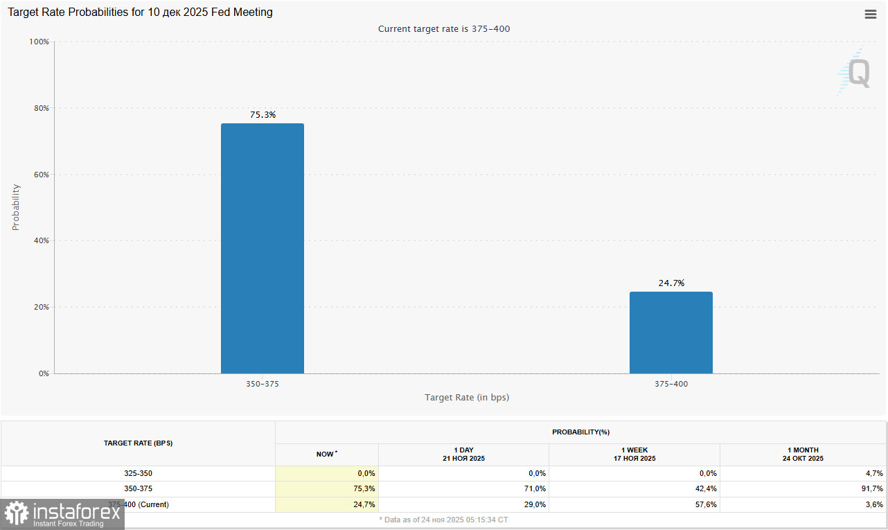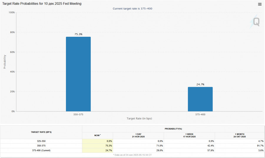 При этом ожидания снижения процентной ставки ФРС в декабре выросли до вероятности 75,3% (на сегодня) после 42,4% неделей назад, а вероятность паузы, соответственно, снизилась до 24,7%.