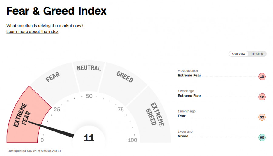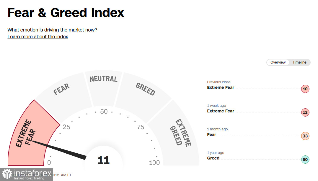 Бычий импульс цены все еще сохраняется, получая поддержку от востребованности доллара в качестве защитного актива. Так называемый индекс страха и жадности стабильно держится в области «экстремального страха» (11 пунктов из 100 в начале американской торговой сессии), подчеркивая высокую степень неуверенности и даже сохраняющуюся панику среди участников рынка.