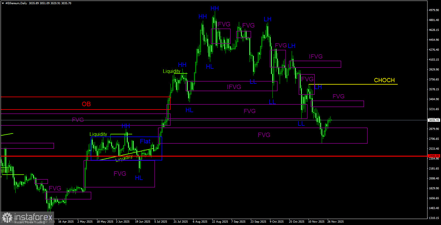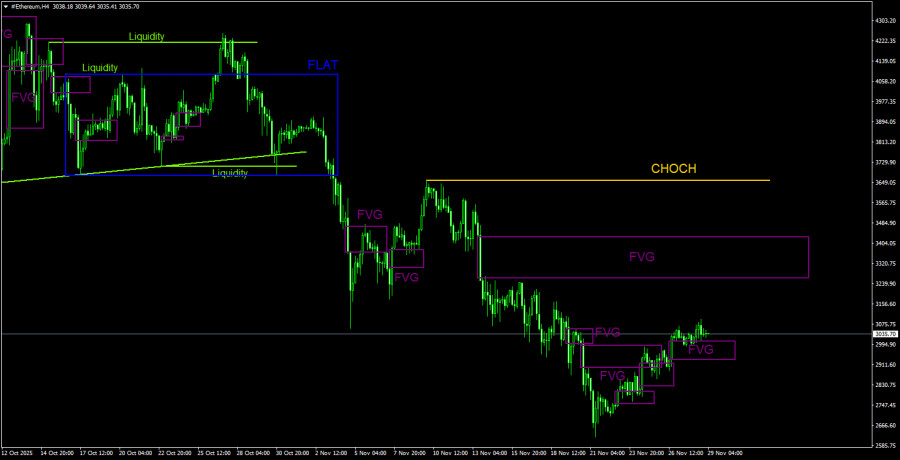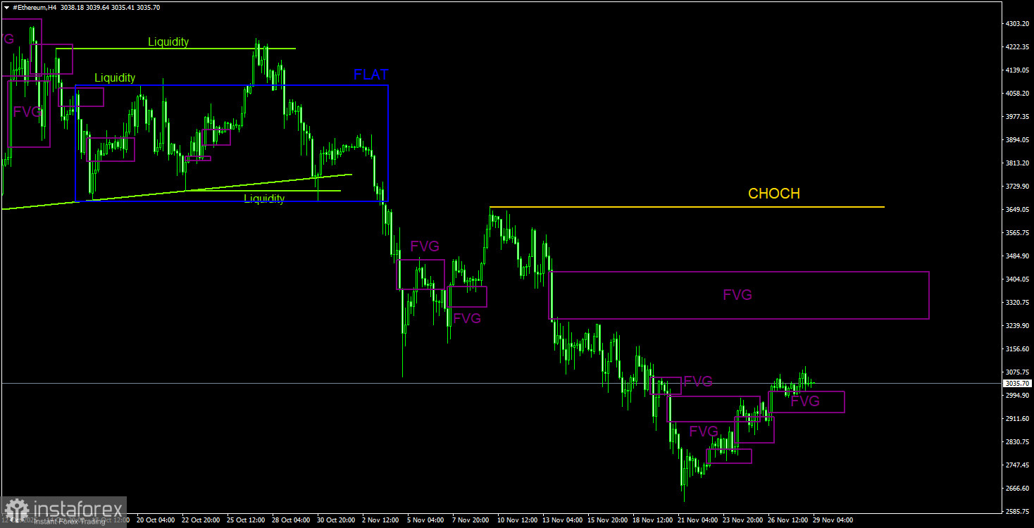 Эфир на дневном ТФ продолжает формирование нисходящей тенденции. В ходе обвала в «черную пятницу» был отработан первый из «бычьих» FVG, в ходе «черного вторника» был отработан второй «бычий» FVG, в ходе последнего витка падения – третий «бычий» FVG. Структура тенденции в данное время понятна, как день, и не вызывает никаких вопросов. Линия CHOCH проходит по уровню 3 666$ – последний LH(Lower High). До тех пор, пока цена находится ниже нее, нисходящий тренд сохраняется. В ближайшее время может наблюдаться коррекция с очевидной целью – ближайший неотработанный «медвежий» FVG. Естественно, мы бы не стали советовать отрабатывать коррекции. Коррекции существуют для того, чтобы открывать сделки по тренду.