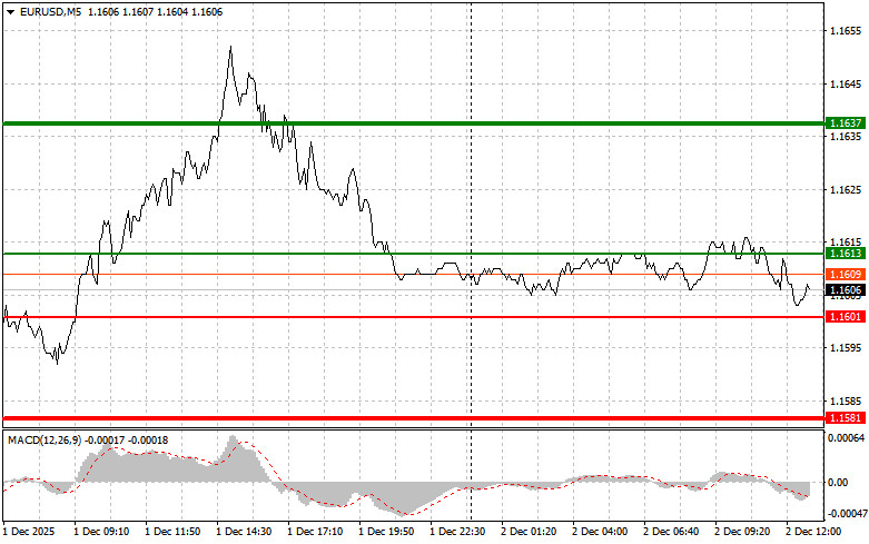 Сценарий №2: покупать евро сегодня также собираюсь в случае двух подряд тестов цены 1.1601 в момент, когда индикатор MACD будет находиться в области перепроданности. Это ограничит нисходящий потенциал пары и приведет к обратному развороту рынка вверх. Можно ожидать рост к противоположным уровням 1.1613 и 1.1637.