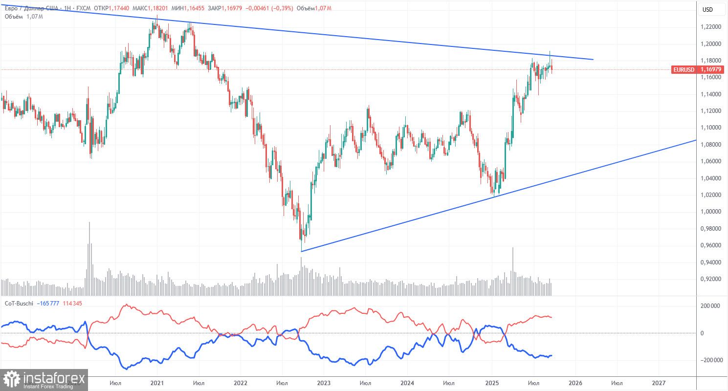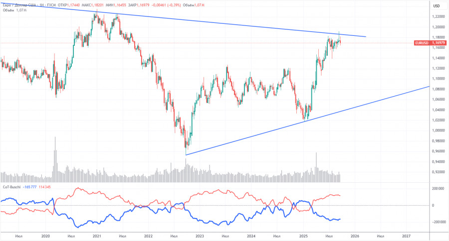 Последний отчет COT датирован 23 сентября. На иллюстрации выше отлично видно, что нетто-позиция некоммерческих трейдеров долгое время была «бычьей», медведи с трудом перешли в зону собственного превосходства в конце 2024 года, но очень быстро ее потеряли. С тех пор, как Трамп вступил в должность президента США во второй раз, падает только доллар. Мы не можем сказать, что падение американской валюты продолжится с вероятностью 100%, но текущее развитие событий в мире намекает именно на этот вариант.