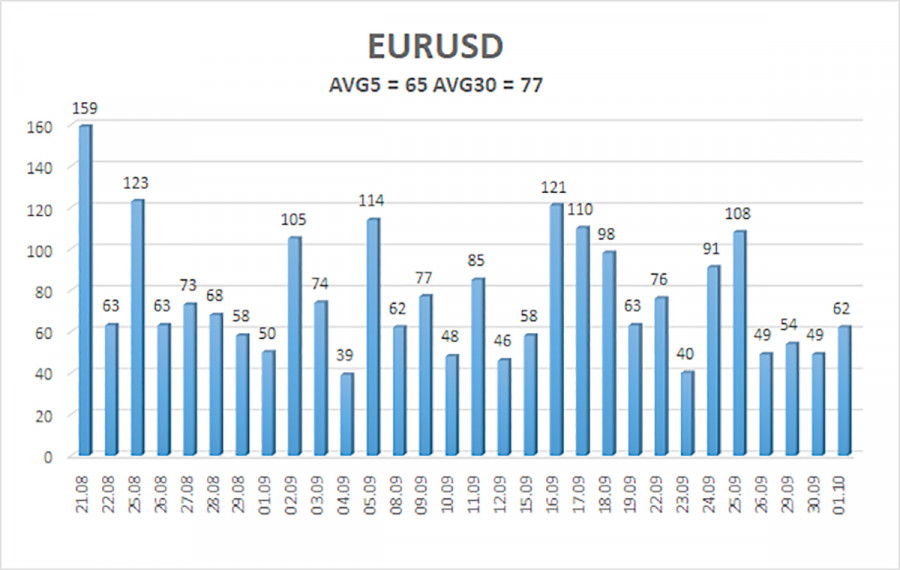 Средняя волатильность валютной пары EUR/USD за последние 5 торговых дней по состоянию на 2 октября составляет 65 пунктов и характеризуется, как «средняя». Мы ожидаем движение пары между уровнями 1,1657 и 1,1797 в четверг. Старший канал линейной регрессии направлен вверх, что по-прежнему указывает на восходящую тенденцию. Индикатор CCI заходил в область перекупленности, что и спровоцировало новый виток нисходящей коррекции.