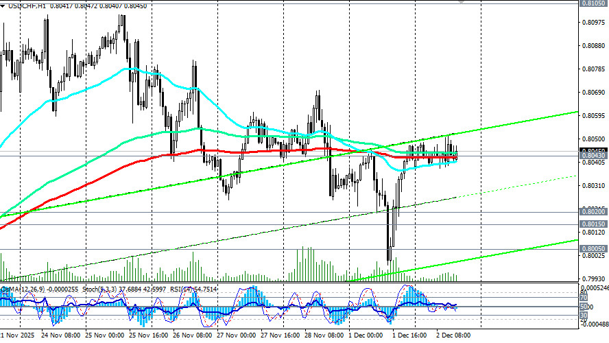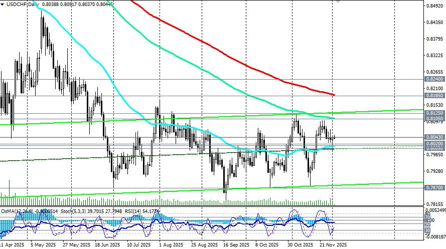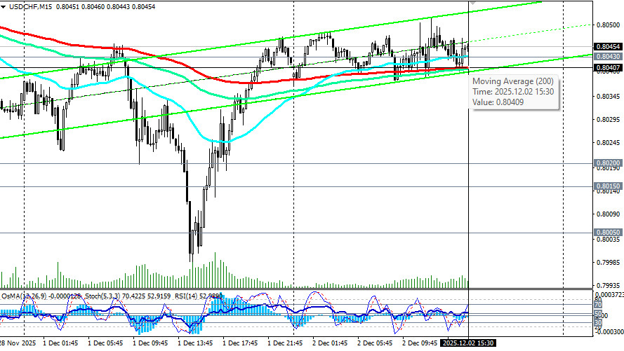 Цена получает поддержку в зоне краткосрочных уровней 0.8040 (ЕМА200 на 15-минутном графике), 0.8043 (ЕМА200 на 1-часовом графике) и выше уровней 0.8020 (ЕМА200 на 4-часовом графике), 0.8015 (ЕМА50 на дневном графике). Однако, в целом, USD/CHF продолжает торговаться в устойчивом медвежьем тренде, начавшем формироваться еще в начале февраля. В случае дальнейшего ослабления доллара и снижения USD/CHF пробой 0.8000 может открыть дорогу в сторону минимумов сентября и года вблизи отметки 0.7830.